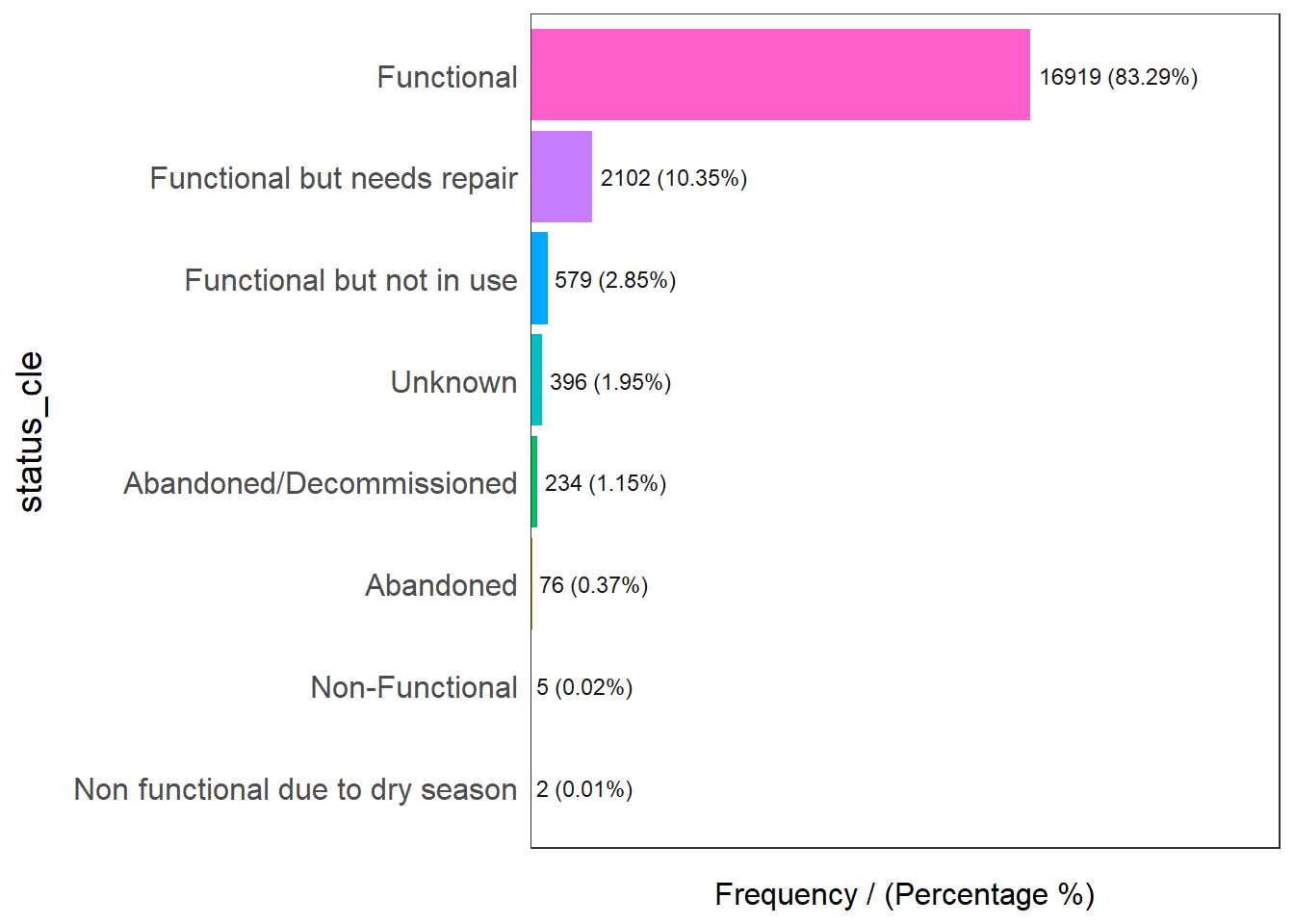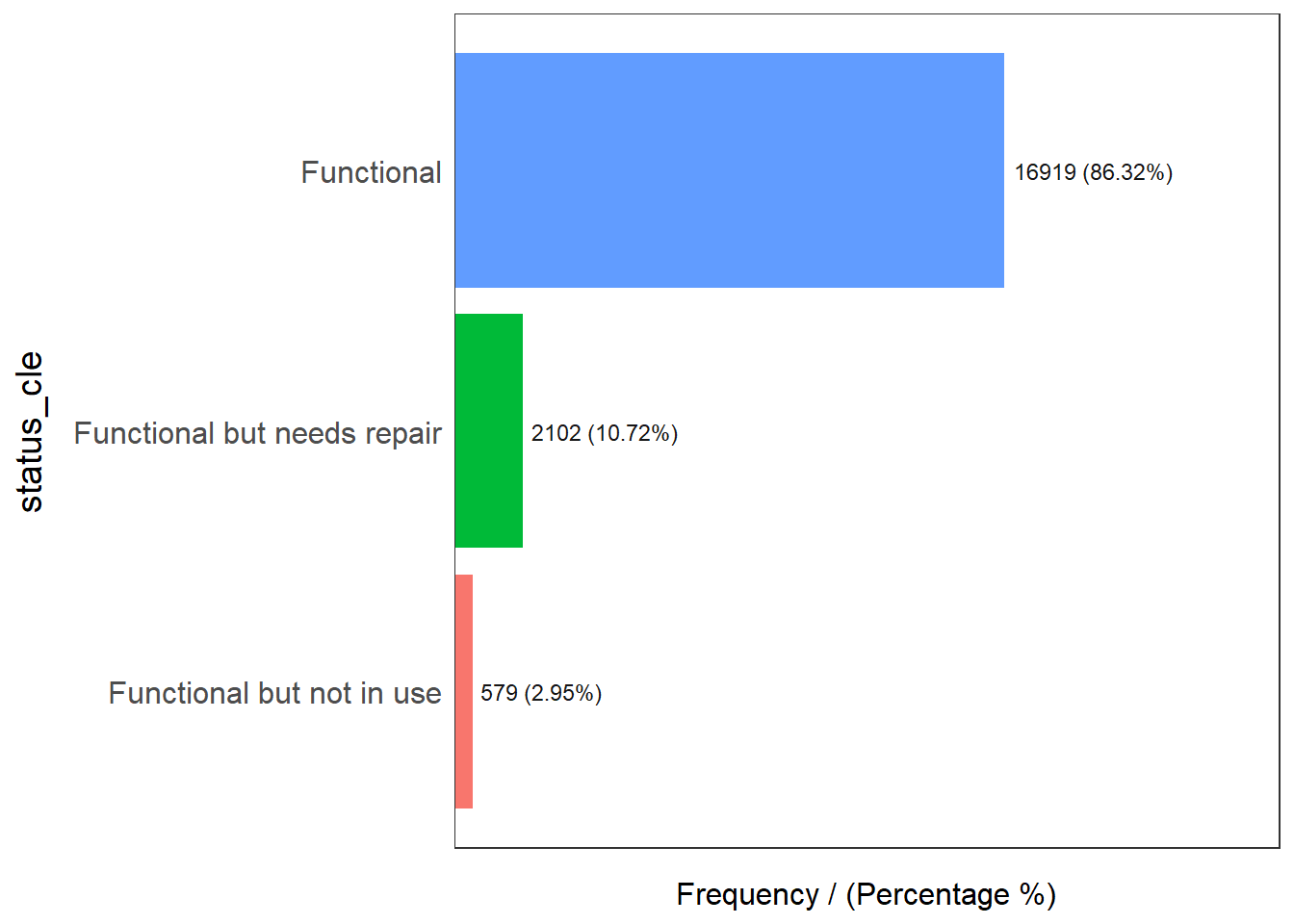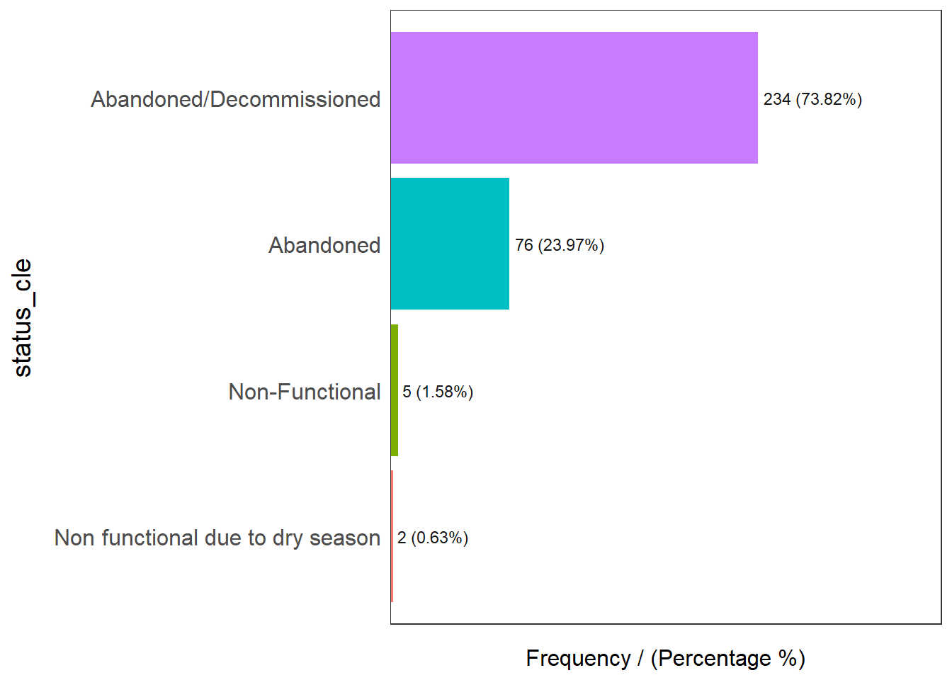 In the code chunk below, freq() of funModeling package is used to display the distribution of status_cle field in wp_nga.